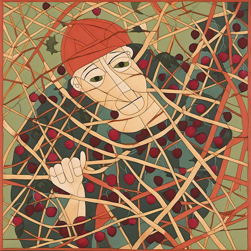 The artwork shows a winemaker entangled in vines, echoing the harvest-day mishap that gave Kares its name and character — a reminder that chance often shapes the most memorable experiences.